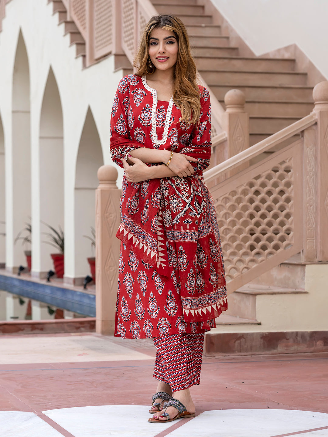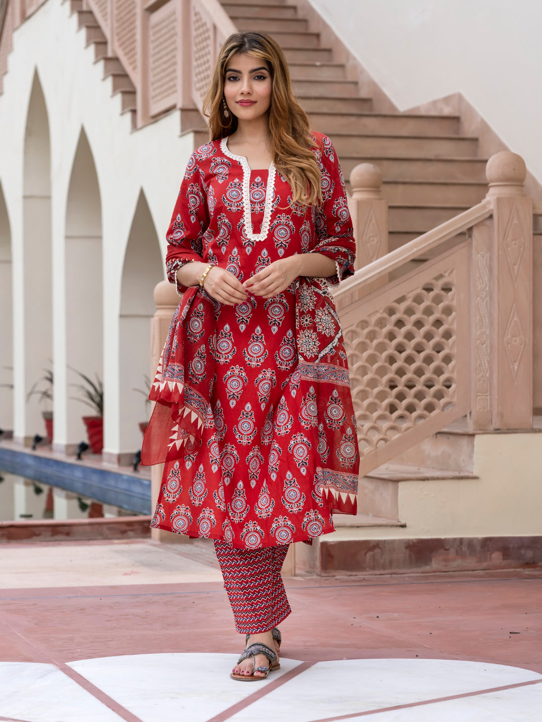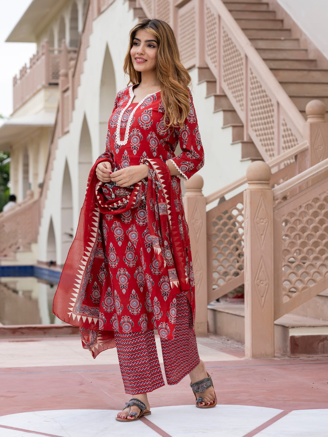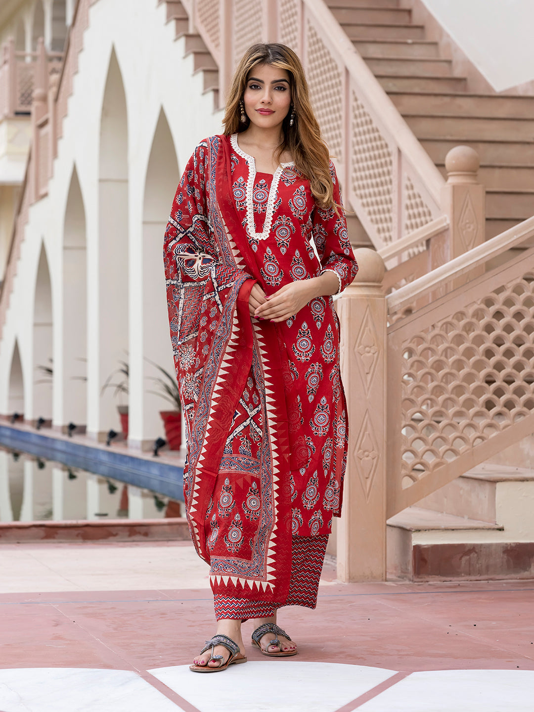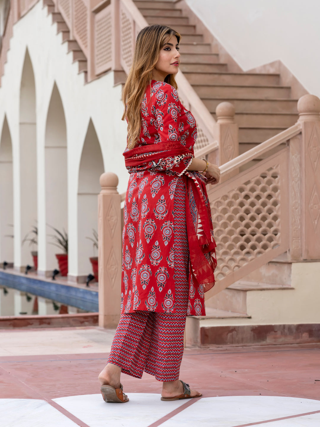 Red, White, Black Printed Kurta with Palazzos & Dupatta