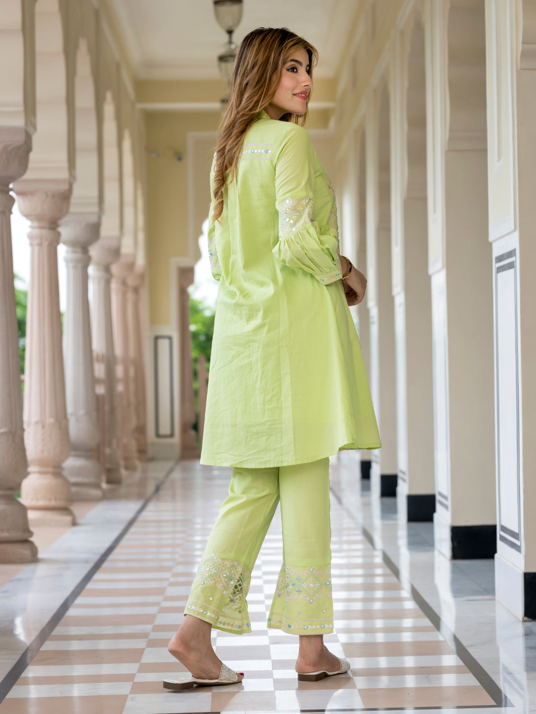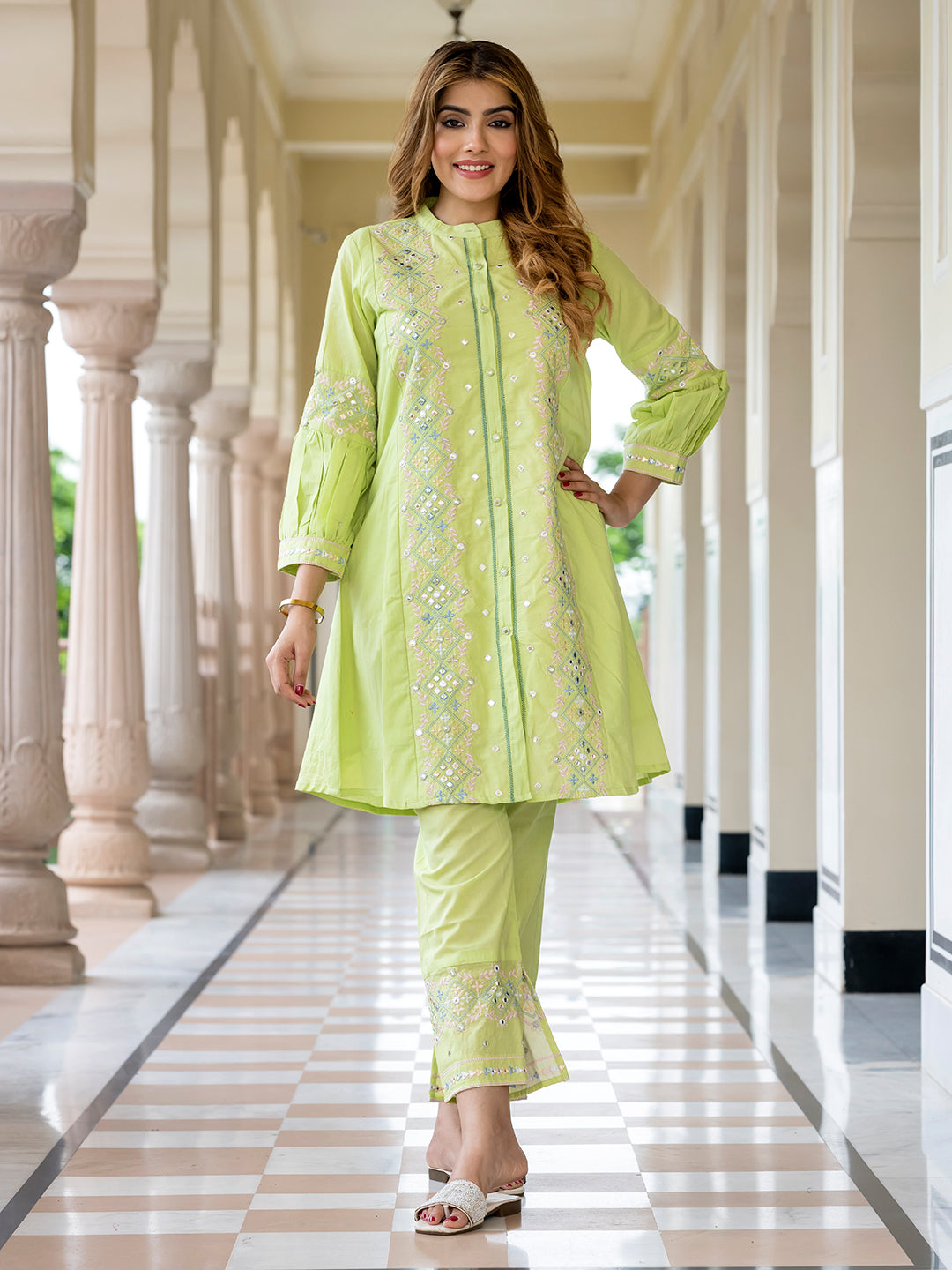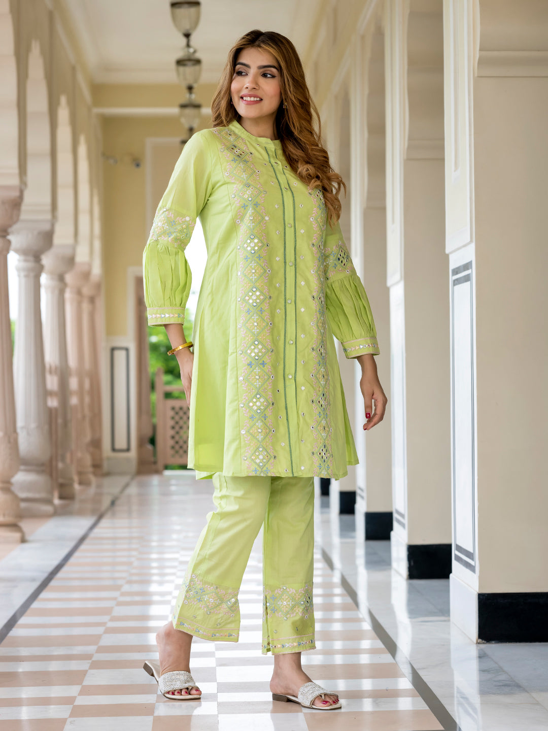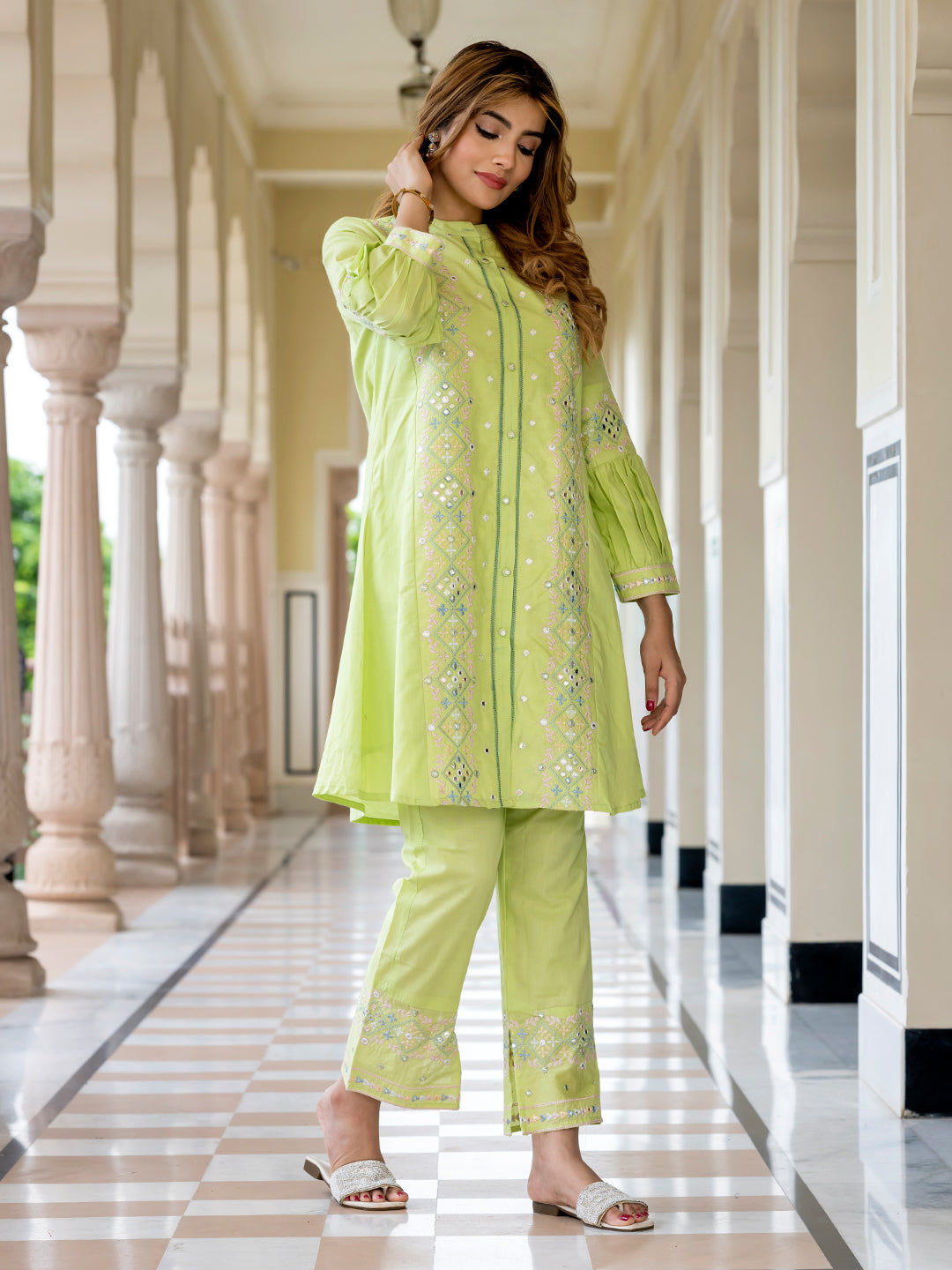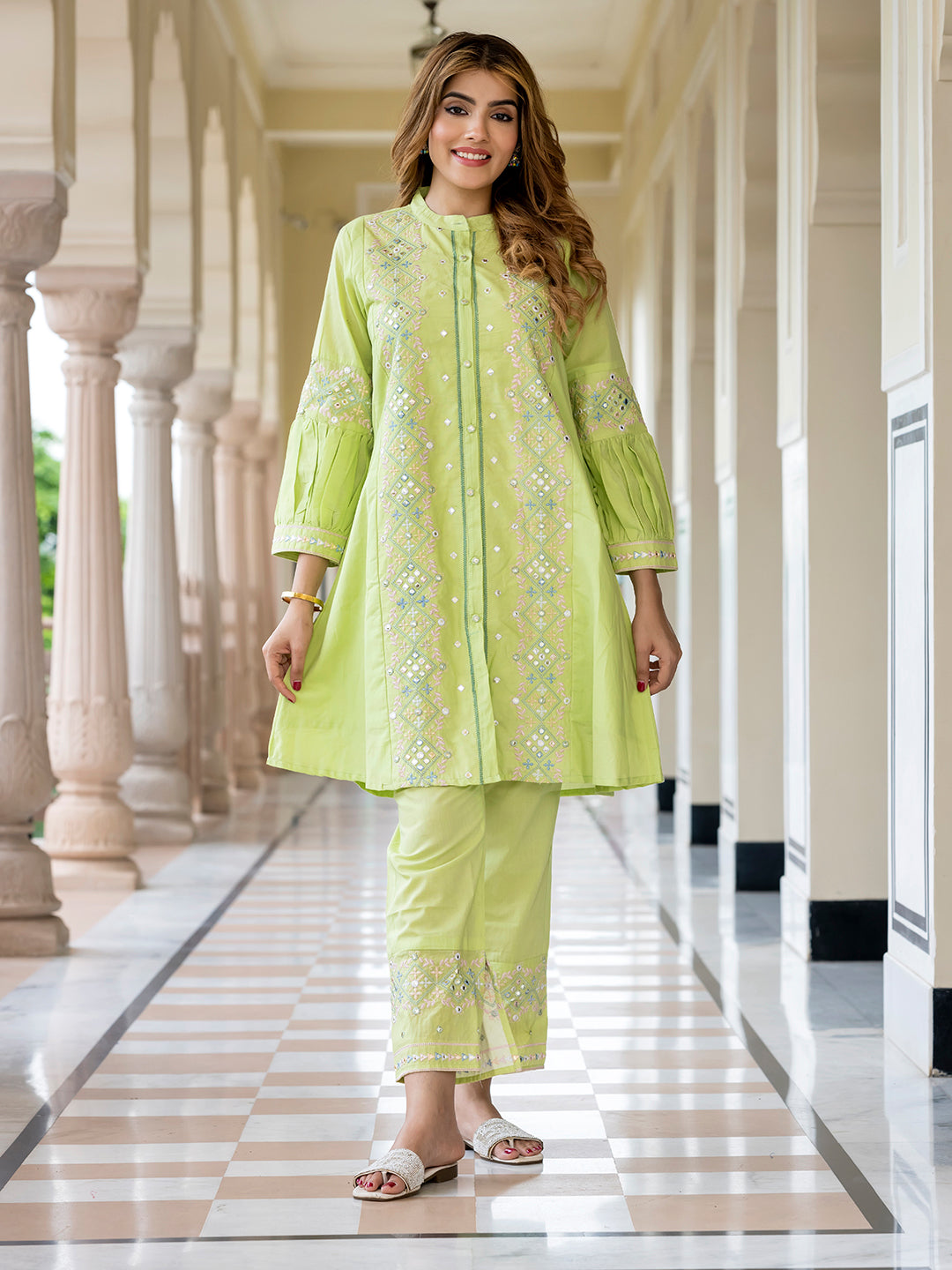 Green embroidered A-line tunic, has a mandarin collar neck, three-quarter sleeves and slip-on closure