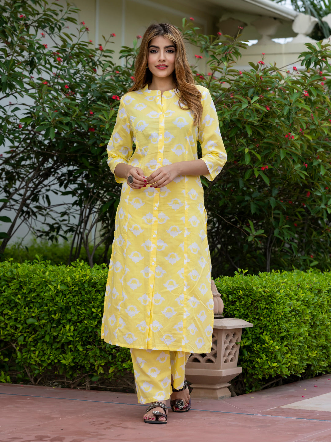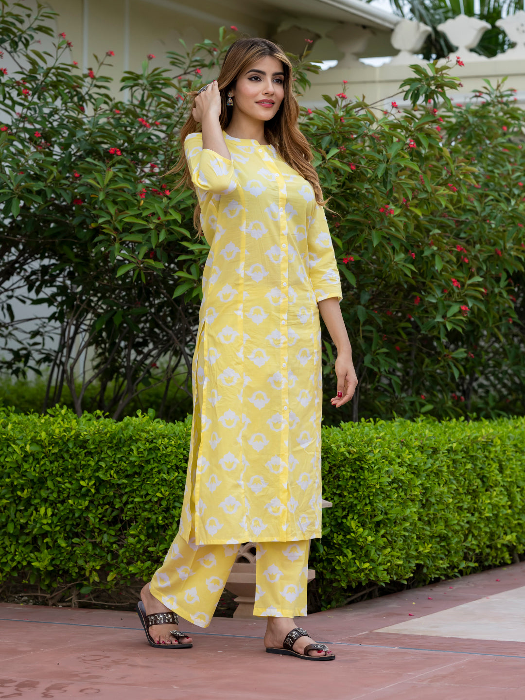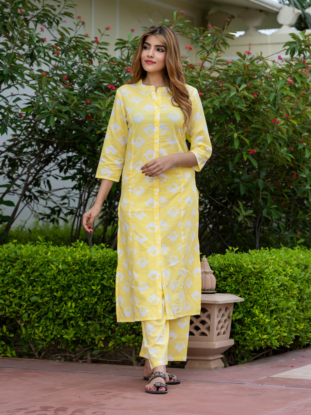 Orni Fashion Yellow Floral print ShoW BUTTON Straight Kurta Set